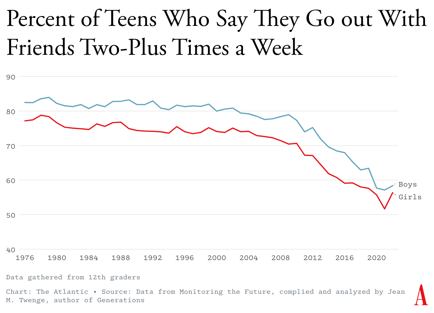 The first chart speaks for itself. It shows the percentage of teens who go out with friends. From 1975 to 2000, the rate was steady. In the last 2 decades, the number of teens who go out with friends has dropped by almost one-third. The biggest drop happened after 2012.