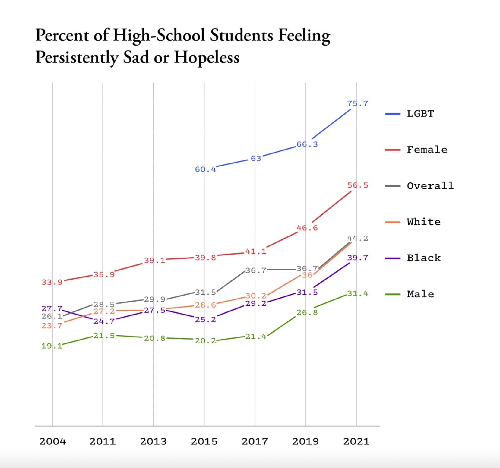 In just 4 years, the percentage of high schoolers “feeling persistently sad or hopeless” went up 37% for females and 47% for males.